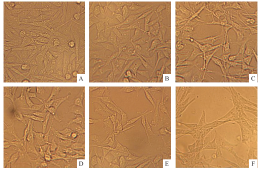图 1 脱氧雪腐镰刀菌烯醇(DON)对仔猪海马神经细胞生长状况的影响(×400) Fig. 1 Effect of deoxynivalenol(DON)on growth state in piglet hippocampal nerve cells(PHNC)(×400) A—F分别表示DON处理质量浓度为0、125、250、500、1 000、2 000 ng·mL-1。 A-F represent DON concentrations are 0, 125, 250, 500, 1 000, 2 000 ng·mL-1, respectively. |