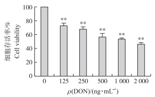 1.2 细胞培养与试验分组将1 mg DON标准品粉末溶于5 mL超纯水中, 配成200 ng·mL-1的DON母液。将不同剂量的DON母液添加到DMEM细胞培养液中, 使其终质量浓度分别为0、125、250、500、1 000和2 000 ng·mL-1。