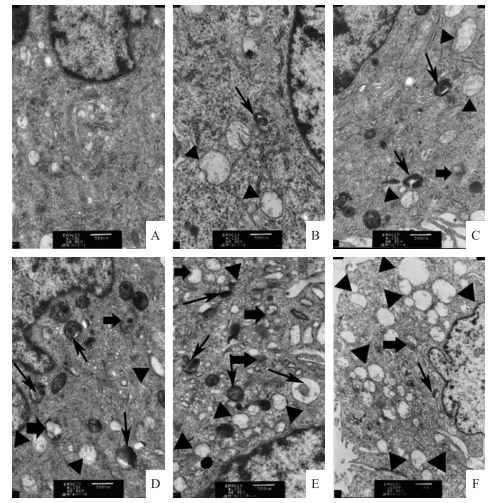A—F分别表示DON处理质量浓度分别为0、125、250、500、1 000、2 000 ng·mL-1。→, ▲, 分别指胞质自噬小体、细胞空泡化及晚期自噬溶酶体。