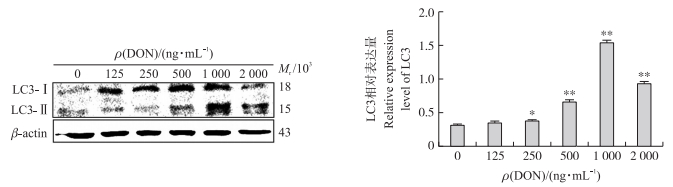 以125、250、500、1 000和2 000 ng·mL-1的DON处理细胞24 h, Western blot检测LC3表达。如图 4所示:随着DON处理浓度的上升, LC3-Ⅱ的表达量先升高后降低, 当DON为1 000 ng·mL-1时, LC3-Ⅱ的表达量最高。与对照组相比, 250~2 000 ng·mL-1 DON处理组LC3表达量显著(P < 0.05)或极显著(P < 0.01)增加。