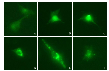 图 5 荧光显微镜观察GFP-LC3蛋白的表达(×200) Fig. 5 Detection of the GFP-LC3 displayed in PHNC by fluorescence microscopy(×200) A—F分别表示DON处理质量浓度分别为0、125、250、500、1 000、2 000 ng·mL-1。 A-F represent DON concentrations are 0, 125, 250, 500, 1 000, 2 000 ng·mL-1, respectively. |