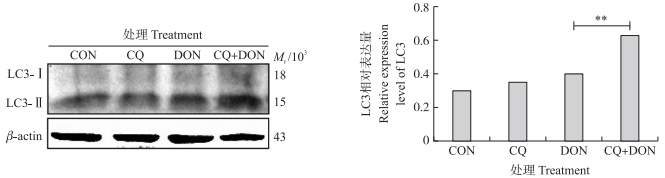 5 μmol·L-1 CQ和1 000 ng·mL-1 DON单独或联合处理细胞24 h, Western blot检测LC3表达结果如图 6所示:CQ和DON联合处理组与单独DON攻毒组相比, LC3-Ⅱ的表达量升高且差异极显著(P < 0.01)。