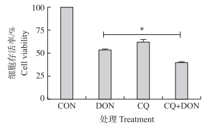 5 μmol·L-1 CQ和1 000 ng·mL-1 DON单独或联合处理细胞24 h, CCK-8法检测细胞存活率, 结果如图 7所示:CQ和DON联合处理组与单独DON攻毒组相比, 细胞存活率下降且差异显著(P < 0.05)。表明自噬水平的下降可显著降低细胞活性。