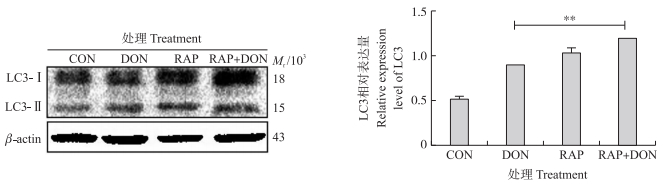 自噬激活剂雷帕霉素(RAP)50 nmol·L-1和1 000 ng·mL-1 DON单独或联合处理细胞24 h, Western blot检测LC3表达, 结果如图 8所示:RAP和DON联合处理组与单独DON攻毒组相比, LC3-Ⅱ的表达量升高且差异极显著(P < 0.01)。