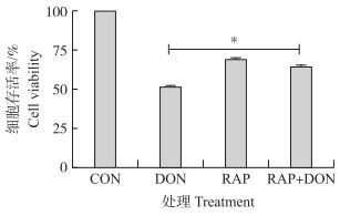 50 nmol·L-1 RAP和1 000 ng·mL-1 DON单独或联合处理细胞24 h, CCK-8法检测细胞存活率, 结果如图 9所示:RAP和DON联合处理组与单独DON攻毒组相比, 细胞活性显著上升(P < 0.05)。表明自噬水平的上升可显著提高细胞活性。
