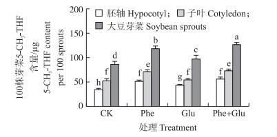 由图 3可知:大豆芽菜子叶中5-CH3-THF含量较多, 占55%以上, 但子叶干质量占整个大豆芽菜的60%以上, 故胚轴中5-CH3-THF的相对含量略低于子叶。苯丙氨酸与谷氨酸及其联合处理下胚轴与子叶中5-CH3-THF含量均显著高于对照, 胚轴中5-CH3-THF含量分别是对照的1.41、1.19和1.53倍, 子叶中5-CH3-THF含量分别是对照的1.34、1.22和1.51倍, 大豆芽菜中5-CH3-THF含量分别是对照的1.33、1.20和1.49倍。表明苯丙氨酸与谷氨酸对大豆芽菜中胚轴和子叶的叶酸含量富集均有显著作用。由于胚根为不可食部分, 本研究仅测定了胚轴和子叶部分的5-CH3-THF含量。