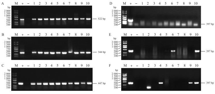 图 3 SSS2-Q、SSS2-Z和SSS2-H家系T3代转基因单株的基因型鉴定 Fig. 3 Genotype identification of T3 transgenic plants of SSS2-Q, SSS2-Z and SSS2-H lines A、B、C. SSS2-Q、SSS2-Z和SSS2-H家系目标片段鉴定; D、E、F. SSS2-Q、SSS2-Z和SSS2-H家系Cas9鉴定。M.分子质量标准; +.阳性对照; -.阴性对照; 1~10分别为SSS2-Q、SSS2-Z、SSS2-H家系T3代10个独立转基因单株。下同。 A, B, C. Identification of target fragments in SSS2-Q, SSS2-Z and SSS2-H lines; D, E, F. Identification of Cas9 in SSS2-Q, SSS2-Z and SSS2-H lines. M. Molecular weight marker; +. Positive control; -. Negative control; 1-10 represent 10 independent T3 transgenic plants of SSS2-Q, SSS2-Z and SSS2-H lines, respectively. The same as follows. |