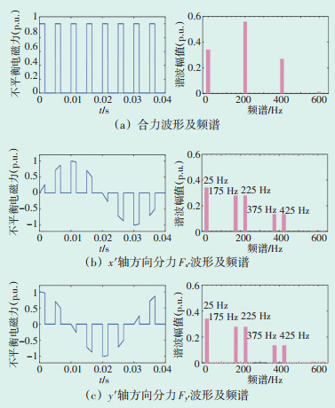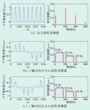根据式(12)和式(13),在转子坐标系下的不平衡磁拉力既包含直流分量,也包含角频率为Pωr的谐波分量,这些分量在向定子坐标系下投影时,将被角频率为ωr的正弦波调制(向定子坐标系下的x′轴、y′轴方向分解),调制后的波形受二极管周期性通断的影响,将被进一步调制成为8个幅值不等的脉冲,如果用标幺值来表示,其波形及频谱如图 9所示。