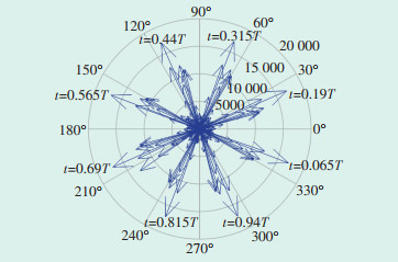 | 图 11 转子不平衡磁拉力矢量图 Figure 11 Unbalanced magnetic pull of the rotor represented by the vector 图中:t—实际时间;T—励磁机一个旋转周期。 |