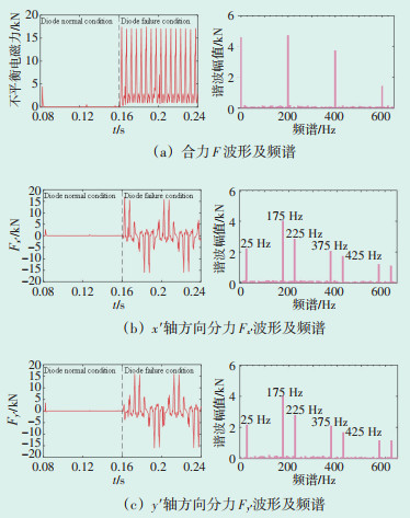 图 12为无刷励磁机定子坐标系下的转子不平衡磁拉力有限元仿真波形及频谱图。从图 12(a)波形图中可以看到:转子在一个旋转周期内共承受8次不平衡磁拉力脉冲作用,电磁力脉冲的频率为200 Hz。由于该脉冲电磁力的方向随着电枢旋转而旋转,故其在x′轴和y′轴方向的分量呈现正弦波性质,从图 12(b)和12(c)波形图中可以明显看到,不平衡力脉冲的包络线呈现出显著的正弦波性质。图 16(a)的波形图中,受故障二极管对各分支电流分布的影响(理论分析部分未予考虑),在故障二极管应关断阶段,实际上励磁机仍存在轻微的磁场不平衡,并产生小幅的不平衡磁拉力。