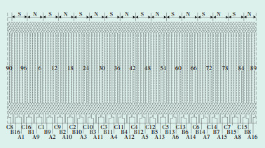 该无刷励磁机有8对静止的磁极,电枢(转子)共有96个槽,电枢绕组为三相结构,采用双层波绕组连接方式,每相绕组有16个并联支路,每个支路占4个槽,绕组连接图如图 2所示。