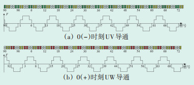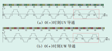 根据电枢绕组的空间对称性及导通规律相似性,可以任意一相、任意支路所连接的桥臂上的二极管为例,对本文选择U相绕组第5条支路(A5)正半桥臂的二极管作为分析对象进行分析。以U相绕组正向导通时段为例,作出二极管在UV→UW换相过程中电枢绕组的电流分布及对应的电枢磁势图,如图 3、图 4所示。因U相反向导通时的磁势波形与正向导通时类似,只是波形方向相反,故对此不作研究。