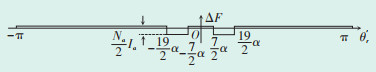当A5支路正半桥臂二极管故障后,其附近出现与转子同步旋转的磁势增量(见图 8),该增量的幅值取决于A5支路中电流的大小及线圈匝数。为了方便列出计算磁势表达式,以磁势增量的中分线为纵轴建立独立的坐标系,电枢磁势增量ΔF见图 8。