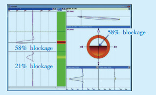 采用氧化皮堵塞成像检测技术对大量锅炉末级过热器、高温再热器管进行检测,发现多处管件内存在氧化皮堵塞的现象,特别是能够较直观、准确反映出管内氧化皮的堵塞率和氧化皮堆积量,可为电厂后续的安全评估及处理提供可靠、准确的数据支撑,应用效果良好。部分现场检测数据和图谱如图 6、图 7所示。