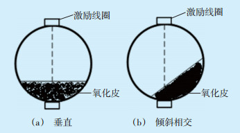 从管件的截面图角度来看,管内氧化皮堆积只存在2种形态,1种是氧化皮堆积面与线圈连接线垂直,另1种是氧化皮堆积面与线圈连接线倾斜相交,如图 4所示。