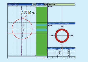 由于电磁场是矢量,具有方向和大小2个参量。如果氧化皮堆积面呈倾斜分布(图(4b)),其氧化皮感应磁场的方向将发生偏离,会导致检测数据失真。特别是管内堆积面严重倾斜时,在检测系统上电压波形信号图显示为负波(图 5),此时就要求检测人员能通过实时显示的条形图谱正确判断非正常堆积信号,及时调整探头的扫查角度,消除偏离信号的干扰。