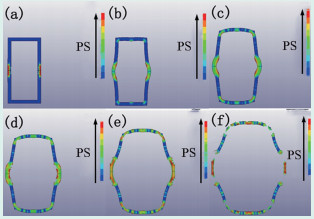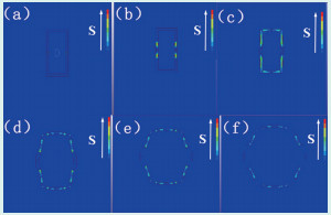 在图 1、图 2所示模型中,施加激励模拟瓷质套管炸裂过程,瓷质套管起爆不同时刻套管壳体的应力和应变分布图分别如图 3、图 4所示。图 3(a)为54 ms时应力仿真效果图、图 3(b)为84 ms时应力仿真效果图、图 3(c)为230 ms时应力仿真效果图、图 3(d)为1300 ms时应力仿真效果图、图 3(e)为1800 ms时应力仿真效果图、图 3(f)为2200 ms时应力仿真效果图;图 4(a)为93 ms时应变分布仿真效果图、图 4(b)为415 ms时应变分布仿真效果图、图 4(c)为1017 ms时应变分布仿真效果图、图 4(d)为1330 ms时应变分布仿真效果图、图 4(e)为1775 ms时应变分布仿真效果图、图 4(f)为2200 ms时应变分布仿真效果图。