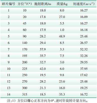 由表 1可见,在采样范围内,5号碎块最重,位于爆心正北方向;14号为次重碎块,位于爆心东南方向。表 1中,大于10 kg的陶瓷碎块共5块,均位于爆心的东北和东南方向,由此推测套管的炸裂方位可能在套管偏东侧位置。