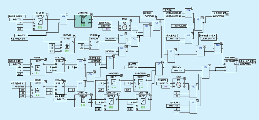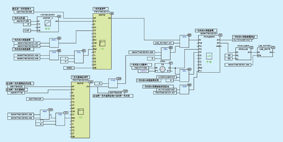 (1) 主调节回路PID17MCS0101的作用是根据 一次风总风量的实际值来调节一次风量指令(经过 各种修正),考虑到一次风总风量波动很大,对锅炉 床温有较大的影响,所以没有使用微分作用,只是 适当减小了比例和积分作用[4]。