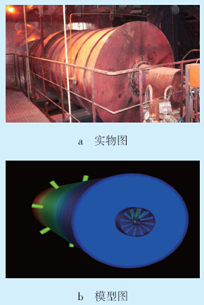 风道燃烧器的工作原理如下:柴油经喷嘴机械 雾化,后经混风孔与空气混合点燃后生成高温烟气 进入布风室,高温烟气通过布风室中的风帽进入锅 炉。图 1a为内蒙古某电厂CFB锅炉风道燃烧器的 实物图,图 1b为对应实物建立的非结构化有限元体 积网格模型图。该电厂共有4个风道燃烧器与风室 相连,考虑到计算机的实际计算承载能力,只对其 中1个风道燃烧器进行建模及数值模拟。