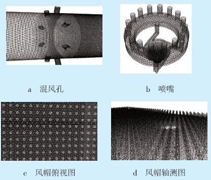 在生成网格时,对风帽、混风孔和喷嘴进行了 网格加密,局部网格如图 2所示。