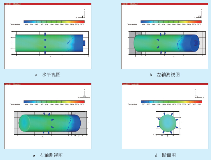 图 6 风道燃烧器轴面温度分布图 |