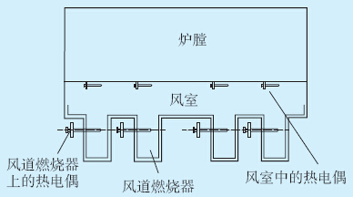 风道燃烧器热电偶测温装置布置如图 7所示。 CFB锅炉点火系统共有8处热电偶测温装置,分别 位于风道燃烧器5445 mm处及风室1970 mm处。