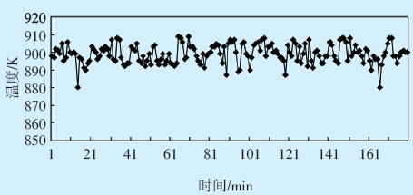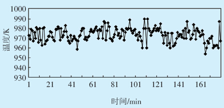 该电厂控制系统采用新华DCS系统,热电偶测 量的温度和压力在DCS上均有显示。CFB锅炉点火 启动一般需要6 h左右,冷态启动点火3 h后达到稳 定状态。本文选取的实测数据为冷态点火启动后 3~6 h的数据,此时,点火系统已经达到稳定状态,即 混风室混风温度、风道燃烧器出口高温烟气温度、 风室温度及压力均恒定。数值模拟计算结果是点 火启动稳定后的结果,因此,实测数据应选用冷态 点火启动后3~6 h的数据与数值模拟计算结果进行 比较分析。每隔1 min 选出1 组数据,共180 组数 据;然后算出平均值,以便与模拟结果进行比较分 析。图 8为风道燃烧器出口温度曲线,平均温度为 972.93 K,图 9 为相应风室温度曲线,平均温度为 899.28 K,图 10 为风室压力曲线,平均压力为 7487.03 Pa。
