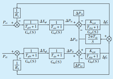 以2个区域互联电网为例,由各环节传递函数 组成的互联电网LFC被控对象动态模型如图 1所 示。