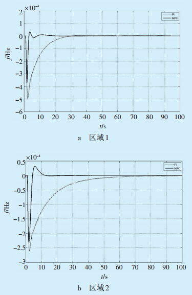 2个区域容量不足的研究方法为:给仿真模型 增加容量限值,2个区域互联电力系统AGC仿真模 型参数仍取表 1中参数,给2个区域机组出力增加 限值0.008p.u.,即令:Pti≤0.008p.u.。在t=1s时给区 域1中添加负荷阶跃扰动ΔPl1=0.01p.u.,分别采用 MPC与PI控制时系统的响应曲线及AGC各区域的 输出响应如图 5、图 6所示。