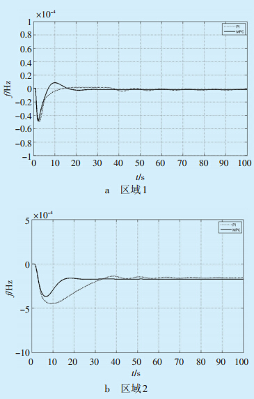 2个区域容量均足够,即不加容量限值时,2个 区域互联电力系统AGC仿真模型参数如表 1所示 (按照2个区域负荷比为1∶6的关系配置参数)。在 t=1s时给区域1和区域2中添加负荷的阶跃扰动, 分 别 设 置Δul1=0.01p.u.,Δul2=0.03p.u.。分别采用 MPC与PI控制时系统的响应曲线及AGC各区域的 输出响应如图 3、图 4所示。