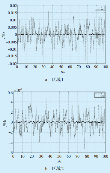 通过仿真输出曲线可看出,对于联络线交换功 率、区域1与区域2的频率控制效果来说,MPC控制 器的控制效果要优于PI控制器的控制效果,MPC控 制依然具有较为明显的时间调节优势及较小的超 调量。 3.3 抗随机干扰性能的仿真研究