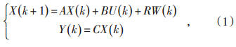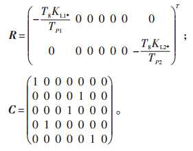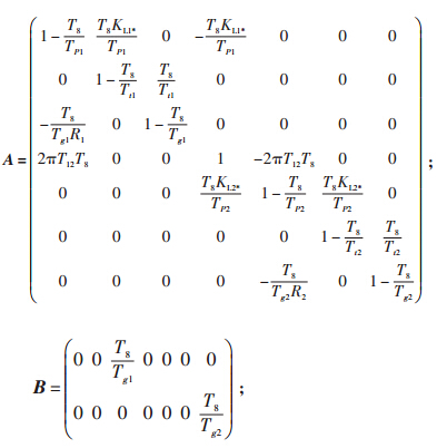 图 1中包括发电机组对象和电网对象2大部 分,其中Ga1 (S)、Ga2 (S)、Gb1 (S)和Gb2 (S)分别为区域1 和区域2发电机组对象;Ga3 (S)、Gb3 (S)分别为区域1 与区域2的电网对象;Δf1为频率的变化量;Pci为调 度指令(作为发电机控制量);ΔPti为各区域发电机 组输出功率增量;ΔPLi为各区域的用电负荷变化量; ΔP12为2个区域联络线交换功率的变化量;Tgi为调 速器时间常数;Tti为发电机时间常数;Ri为机组调差系数;Δxgi为调速器位置增量;KLi*为负荷的频率调节 效应系数;TPi为负荷的频率调节惯性时间常数;T12 为区域1和区域2之间联络线功率同步系数。 被控对象的离散状态空间模型如公式(1):