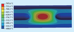 利用数值仿真软件建立水冷壁H型鳍片温度场 分析模型,其中水冷壁向火侧热负荷为105kW/m2, 管内工质温度400℃,工质与水冷壁管内壁对流换 热系数为28.5kW/m2K,水冷壁背火侧敷有保温材 料,视为绝热体[3, 4, 5],分析结果如图 7所示。可以看 出,整个鳍片区域温度分布极不均匀,鳍片中心温 度最高,根部温度较低,最大温差达到397℃,使得 鳍片内部因热膨胀不一致而产生较大的热应力。 此外,H型鳍片最高温度达到800℃左右,远远超过 12Cr1MoVR的许用温度(565℃)[6],使鳍片发生严 重脱碳和老化。