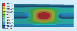 通常,鳍片中心温度与鳍片宽度的平方成正 比,与鳍片厚度成反比[7]。为了研究H型鳍片厚度 对其温度分布的影响规律,找出鳍片的最佳厚度, 建立了不同厚度的鳍片温度场分析模型,计算不同 厚度鳍片最高许用温度,结果见表 2。由表 2可知, 随着鳍片厚度的增加,鳍片最高温度不断降低,当 其厚度增至19mm左右时,鳍片最高温度为562℃, 已降至其许用温度范围内。图 8为鳍片厚度为19 mm时鳍片区域温度场分布情况,可以看出,鳍片温 度分布较为均匀,最大温差减小为162℃,这样可以 有效减小鳍片内部热应力,提高机组的安全稳定 性。
