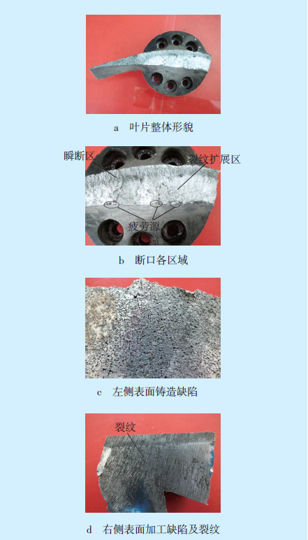 为了查明送风机叶片断裂原因,对断裂的送风机叶片取样进行综合失效分析。试验按照国家及电力行业现行相关标准规范进行,所采用仪器、设备均在检定(校准)有效期内。 2.1 宏观形貌检查