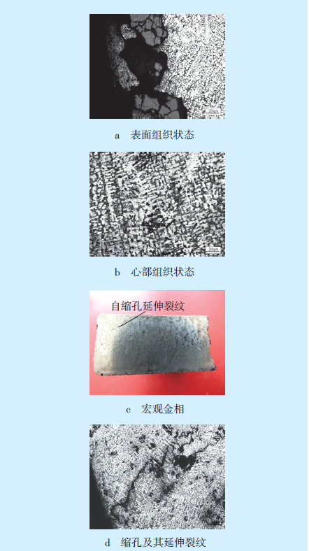 按照《DL/T 884-2004火电厂金相检验与评定技术导则》要求,利用Axio Observer Alm型金相显微镜对断裂的送风机叶片取样进行显微组织检测[5],以确定其金相组织是否异常,检测结果如图 2所示。可以看出,该叶片为铸造组织(见图 2a、2b),α枝晶较为粗大(见图 2b);同时,组织中存在大量气孔及缩孔缺陷,并伴有自缩孔处延伸出的裂纹(见图 2c、2d)。