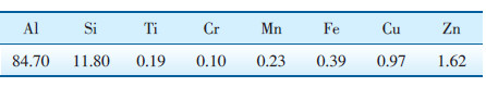 经查阅国内外相关资料,未获得该叶片材料的化学成分[3],采用直读式光谱仪对断裂叶片进行检测,检测结果见表 1。由表中数据可以看出,叶片材料中主要以Al、Si元素为主,还含有少量的Ti、Cr、Mn、Fe、Cu、Zn。按照表 1各化学成分质量分数及《GB/T 1173-2013铸铝合金》标准,基本确定该叶片材质属于Al-Si系中的铸铝材质[4]。
