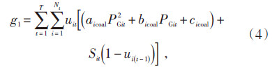 传统的火电机组运行要消耗化石能源,在成本函数中需要考虑煤耗成本,另外启停费用占总成本的比例也较大[14, 15],因此在火电机组运行成本中应考虑机组的启停成本。机组运行成本函数如下:
