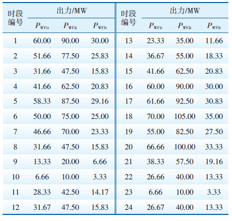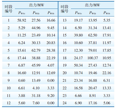 按上述参数进行计算,取弃风容量价格为500元/MW,可得火电机组各时段调度出力结果如表 3所示,3个风电场各时段调度出力如表 4所示。
