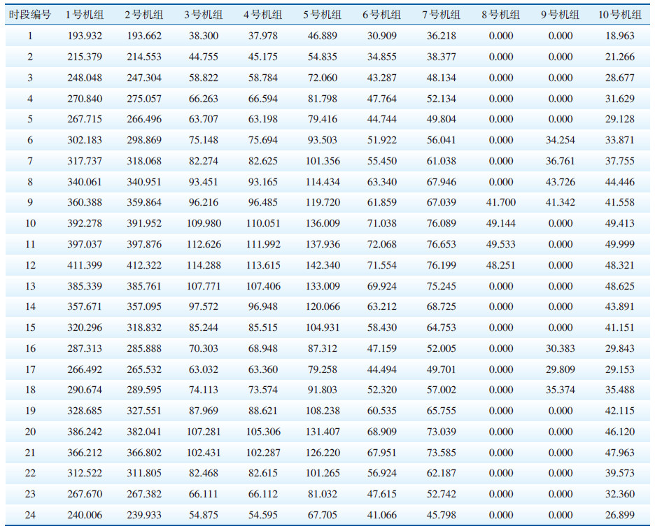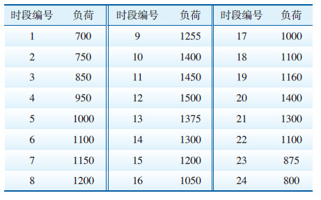 针对某区域电网进行算例分析,该区域包括10台火电机组和3个风电场,调度决策周期取24 h。10台火电机组额定容量依次为455 MW、455 MW、130 MW、130 MW、165 MW、80 MW、85 MW、55 MW、55 MW、55 MW。风电场每小时预测出力可信度为0.85,1号、2号风电场的营运价格为550元/MW,3号风电场为570元/MW;旋转备用容量价格为112元/MW;随机置信水平取0.85。3个风电场在研究周期(划分为24个时段,1 h为1时段,并按时间顺序编号)内各时段预测出力见表 1,该区域电网各时段的负荷见表 2。