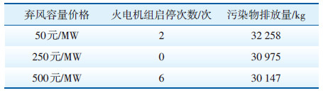 本调度模型考虑了由于风电场弃风引起的弃风成本,表 5给出了取不同风电弃风容量价格时,10台火电机组在24 h内的启停次数及污染物排放量的变化。