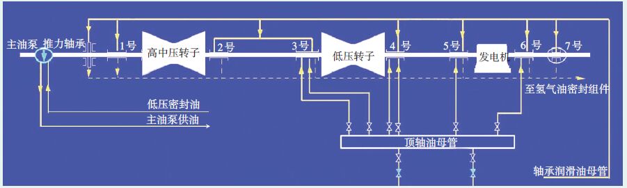 内蒙古京泰发电有限责任公司1号、2号汽轮机为上海电气电站设备有限公司汽轮机厂生产的NZK300-16.67/538/538型,亚临界、单轴、双缸双排汽、一次中间再热、反动式、直接空冷凝汽式机组,整个轴系由高中压转子、低压转子、发电机转子、励磁机转子、前箱小轴以及7个轴承组成,汽轮机润滑油系统如图 1所示。5号、6号轴承为圆筒瓦结构,其余轴承均为可倾瓦结构,3号—6号轴承设有顶轴油管,1号、2号、7号轴承无顶轴油管。