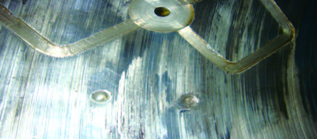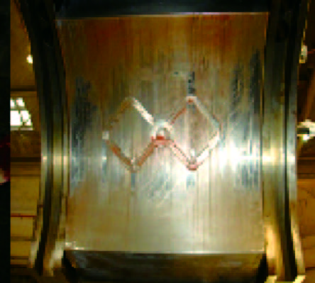 (3) 补焊瓦块温度测点部位,着色检查乌金无裂纹、气孔、夹渣等缺陷,然后修刮研磨瓦块乌金面,保证瓦块与轴颈的接触面积。4号轴承左侧下瓦处理后的情况见图 7。
