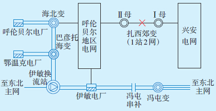 500 kV海—牙—兰工程投运后,若500 kV扎兰变电站采用接入方案1,呼伦贝尔电网交流外送线路为4回:500 kV扎兰—冯屯双回、伊敏—红城双回;若500 kV扎兰变电站采用接入方案2,则呼伦贝尔电网交流外送线路为6回:500 kV伊敏—冯屯甲乙、扎兰—冯屯双回、伊敏—红城双回。