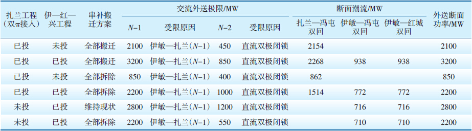 | 表 1 采用接入方案1,不同工程时序与串补投退方案下呼伦贝尔电网交流外送极限、断面潮流分布情况 |
