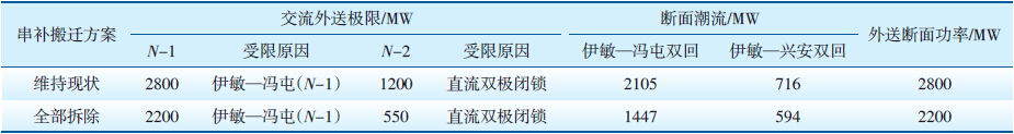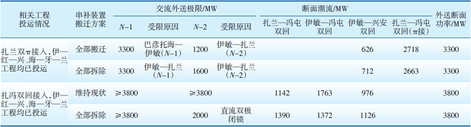 (5) 在伊—红—兴工程已投产的前提下,若将冯屯串补装置全部搬迁至扎兰变电站,扎兰变电站双π接入伊冯甲乙线后呼伦贝尔电网交流外送极限(3200 MW)比全拆串补装置后外送极限(2200 MW)高约1000 MW。