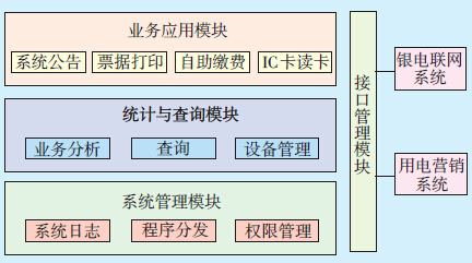 1.2 系统功能自助缴费系统主要由系统管理、统计与查询、接口管理、业务应用4个功能模块构成,结构如图 1所示。