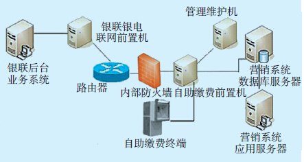 1.4 系统组成自助缴费系统基于电力企业城市集中地,可直接连接到电力公司的前置机系统,并通过前置机和电力营销系统进行交易,图 2为系统网络图。自助缴费系统硬件主要包括营销系统应用服务器、自助缴费终端、营销系统银电联网前置机、数据库服务器、银行后台服务器、自助缴费前置机、路由器、防火墙等[2]。自助缴费终端包括液晶显示器、主机、票据打印机、读卡器、监控系统等。软件系统包括电力营销应用系统、自助缴费中间接口系统、银行业务系统。系统与银行系统的通信方式选用光纤作为主通信线路,通信为TCP/IP协议或X.35协议,采用电力营销系统专用数据包格式,使用数据包校对验码进行安全控制。