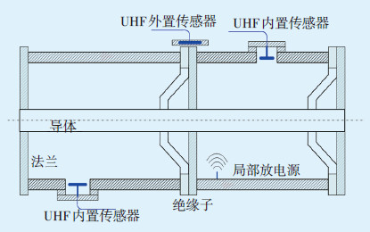 局部放电源可能为设备外壳或导体上的毛刺,盆式绝缘子内部砂眼、松动的固定夹件等。而特高频传感器可以为内置传感器或外置传感器,其中内置传感器抗干扰性更好。特高频局部放电检测原理如图 1所示。